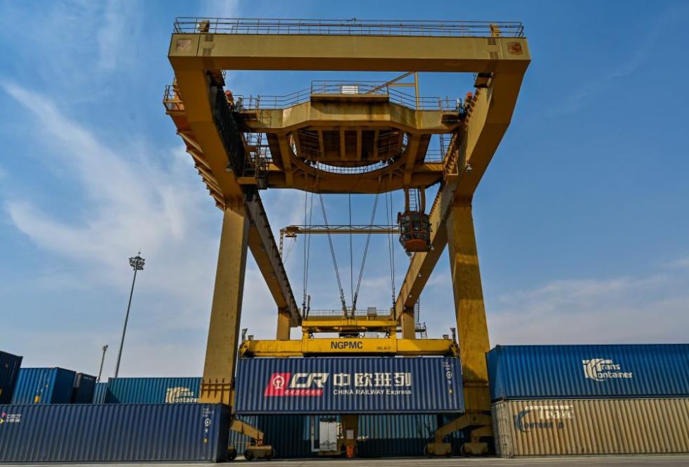2020年4月13日,在滿洲里鐵路車站集裝箱場,吊車裝運集裝箱。中俄最大陸路口岸滿洲里充分發揮對俄運輸大通道的橋梁紐帶作用,積極服務中歐班列運輸,助力中歐班列高質量發展。 新華社記者 于嘉 攝